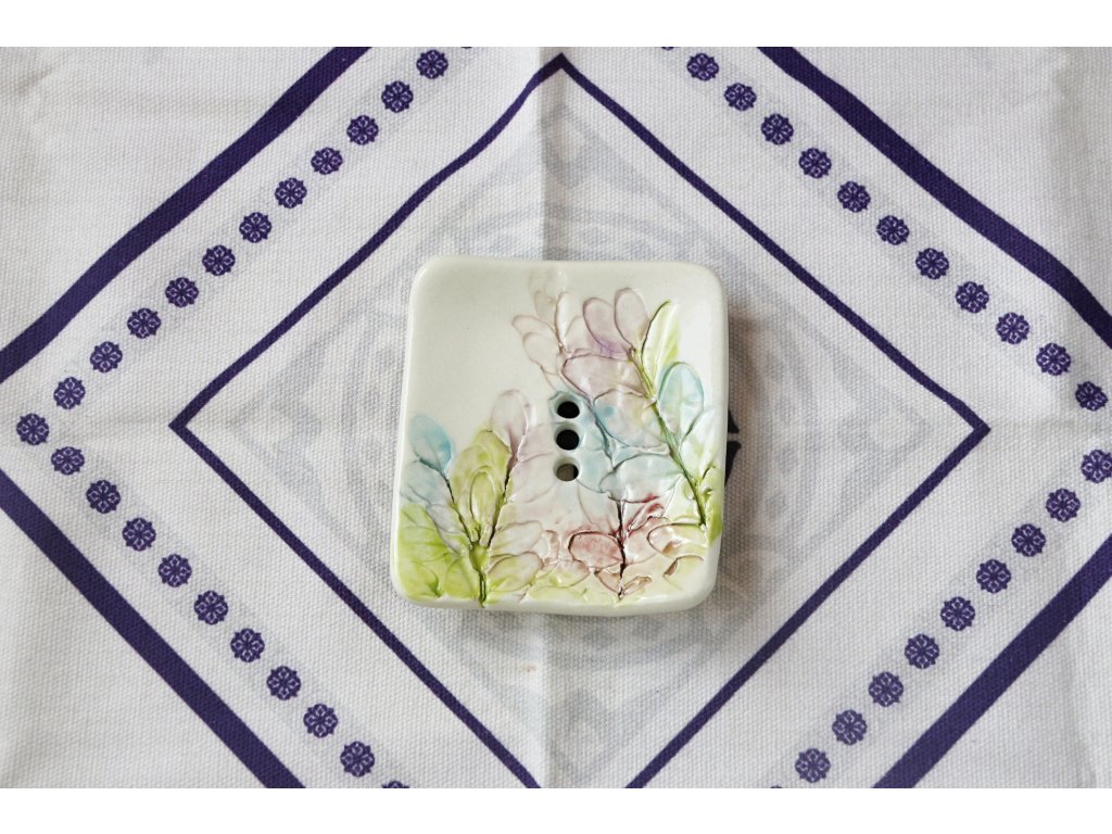 Ručně vyráběná keramická mýdlenka s odtokovými otvory pro delší životnost mýdla.