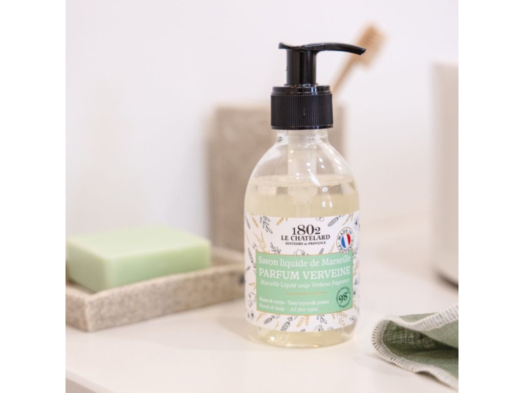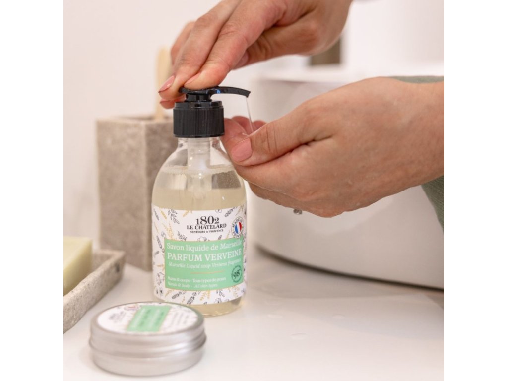 Tekutá mýdla Le Chatelard 1802 se vyrábí přímo v Provence podle tradiční marseillské receptury moderními postupy, což jim dodává jedinečnou jemnost. Jsou obohacena o pečlivě vybrané rostlinné oleje, zejména kokosový olej, který pokožku vyživuje. S 98 % přírodních složek a bez parabenů, sulfátů či jiných dráždivých látek, poskytují šetrné a účinné čištění pro ruce i tělo. Respektují přirozené pH pokožky, nevysušují ji a proměňují každodenní péči v autentický zážitek.